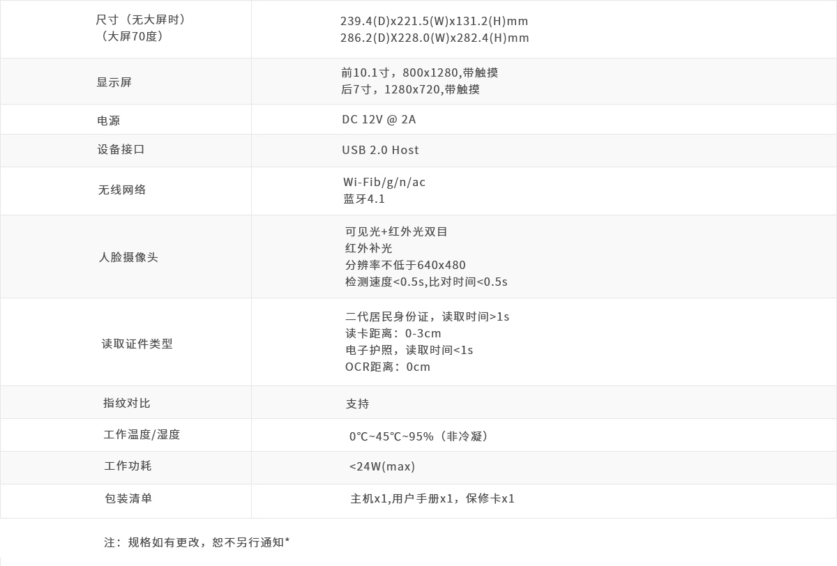 设备将现场拍摄的人员照片与读出的身份证件信息进行比对、 验证,辅助管理人员实现人证合一验证,免人脸采集。