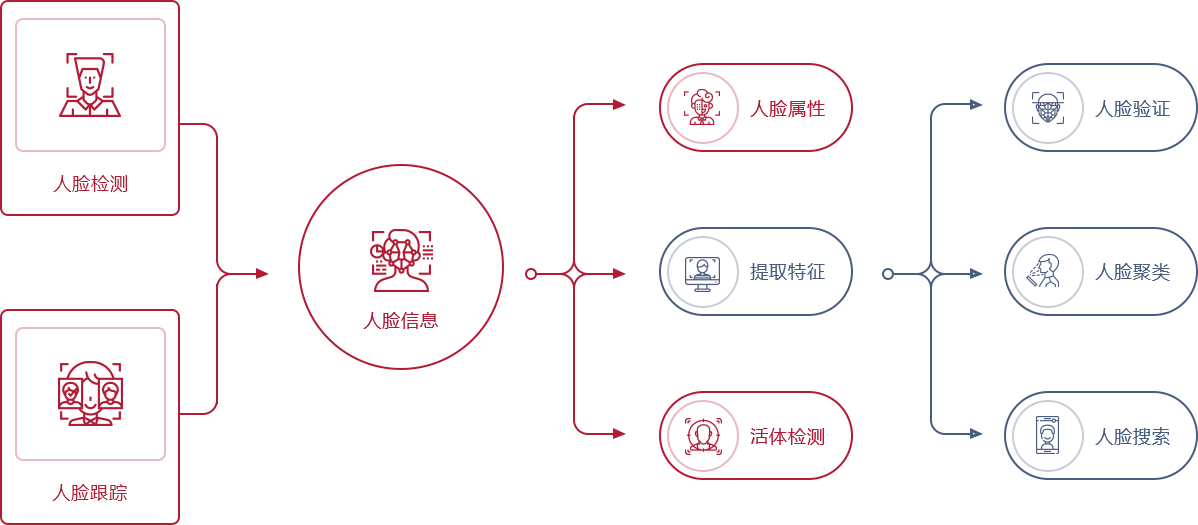 人脸验证(Face Verification)可以计算两张人脸的相似度,从而判断是否为同一个人。人脸验证技术可以实现 1:1 和 1:N 的人脸相似度比对,适用于身份识别及相似脸查询等应用场景。 该技术采用深度学习方法对大量数据进行特征提取,利用特征匹配程度来区分不同的人脸。